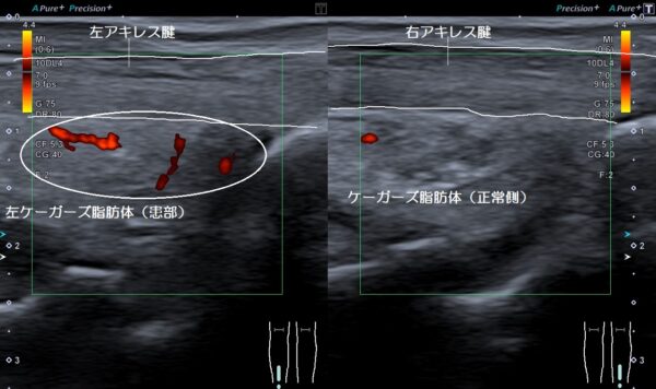 超音波画像観察を行うと左アキレス腱の深部にあるケーガーズ(Kagers)脂肪体に損傷による炎症が発生していました(画像、丸の中の赤色の箇所)。