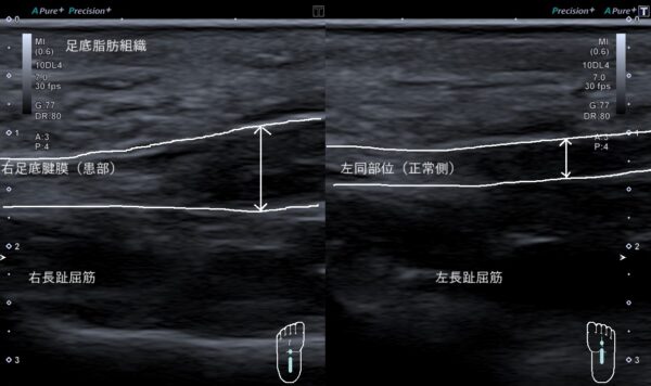超音波画像観察を行うと右足底腱膜が、左と比較して厚みが増して太くなっていました(画像、矢印の長さの比較)。