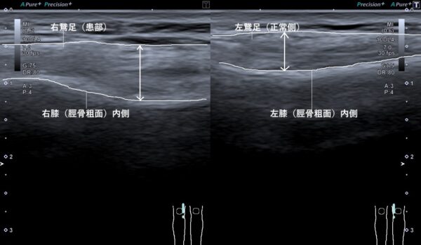 超音波画像観察を行うと右鵞足部の筋肉が傷んでいて、左と比較すると明らかに腫れていました(画像、矢印の長さの比較)。