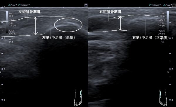 また、第5中足骨基部に付着している短腓骨筋腱が腫れて太くなっていました(画像、矢印の長さの比較)。