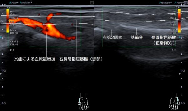 超音波画像検査を行うと右長母指屈筋腱の周囲が過剰な炎症(傷んだ組織を治す生体反応)を起こし、血流量が通常よりも増加していました。