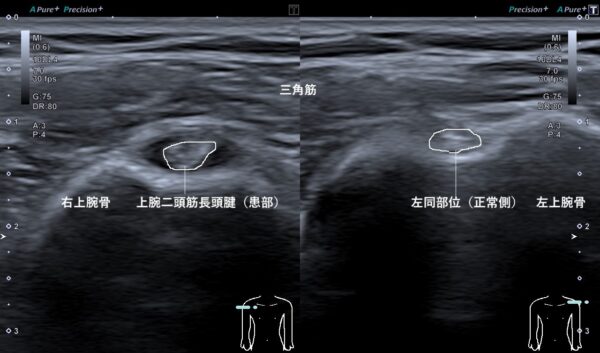 超音波(エコー)画像観察を行うと右上腕二頭筋長頭腱が左に比べて腫れて、その周囲は水(滑液)が過剰に溜まっていました(画像、白線で囲んだ丸の周囲の黒い箇所)。